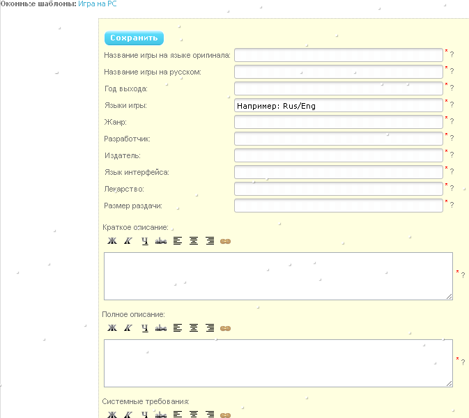 Название игры на русском:</td><td> <input maxLength=150 id="pcgruname" style="color:black; width:300px; padding:2px;" class="input11"> <span style="color:red;font-weight;bold;"><sup>*</sup></span> <span style="cursor:help;" onclick="javascript:help2()" title="Нажмите на вопросительный знак, чтобы увидеть больше информации">?</span>
